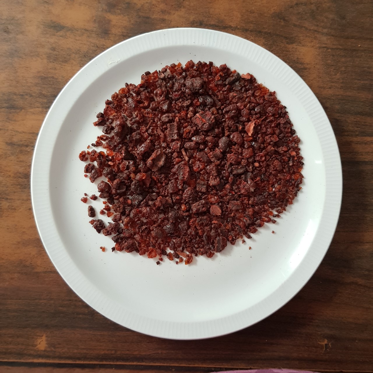 Lac extract yields crimsons to burgundy reds to deep purples. The colourant is similar to cochineal but colours achieved are warmer, softer, and more muted. The lac dye has high light and washfastness on silk and wool. 5-8% dye to WOF is all that is needed for a medium depth of shade.